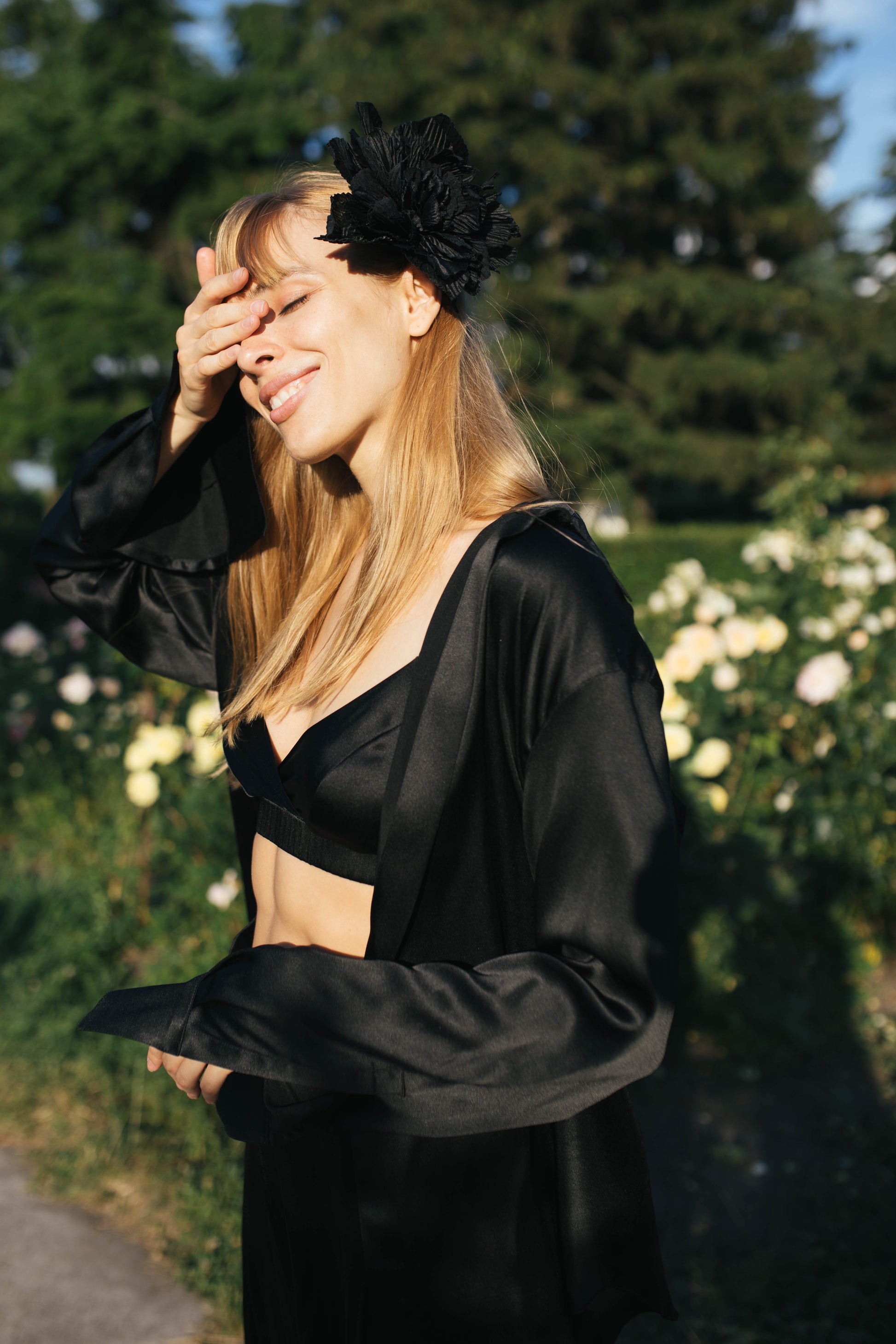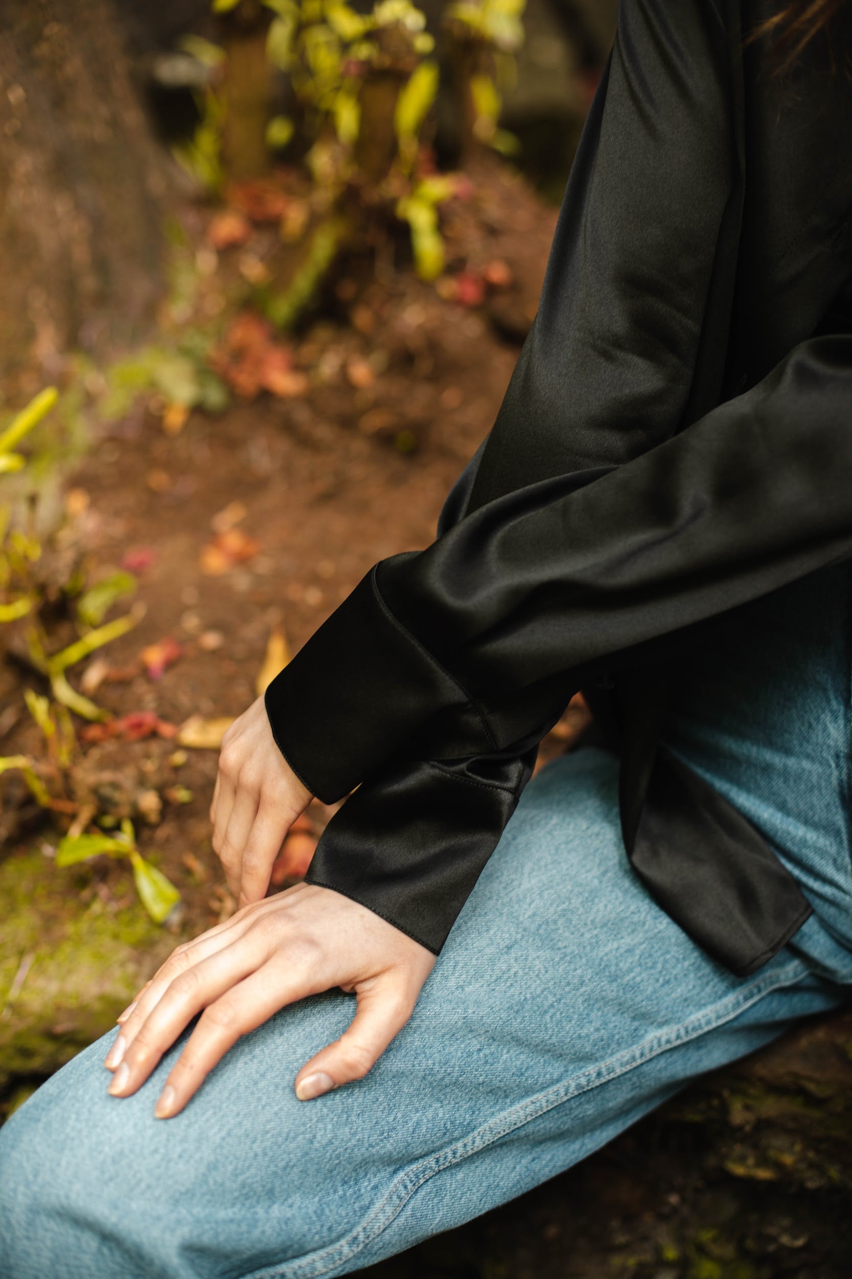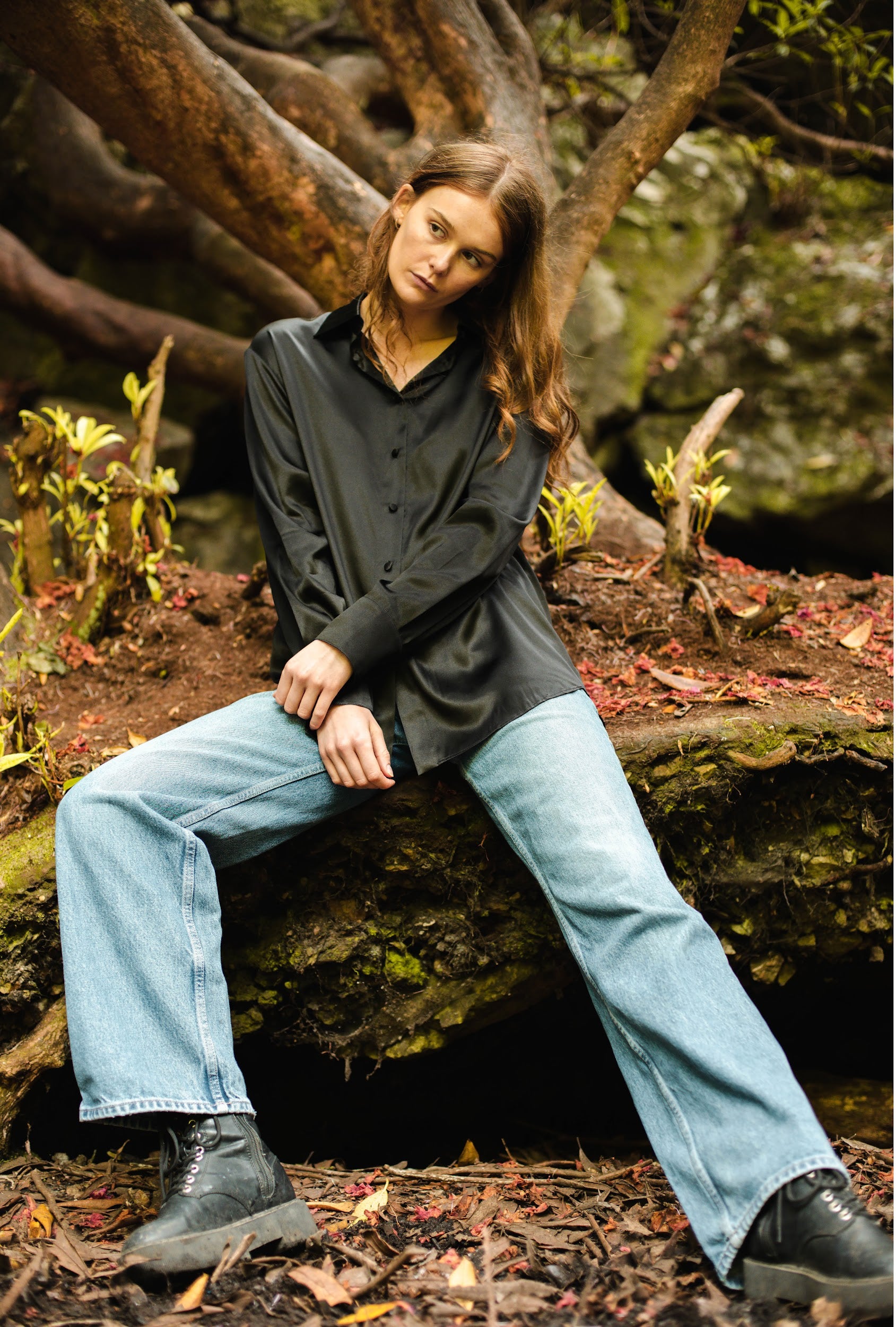 Cut from organic peace silk, it has an effortlessly chic, oversized silhouette with buttoned cuffs and a curved hem.