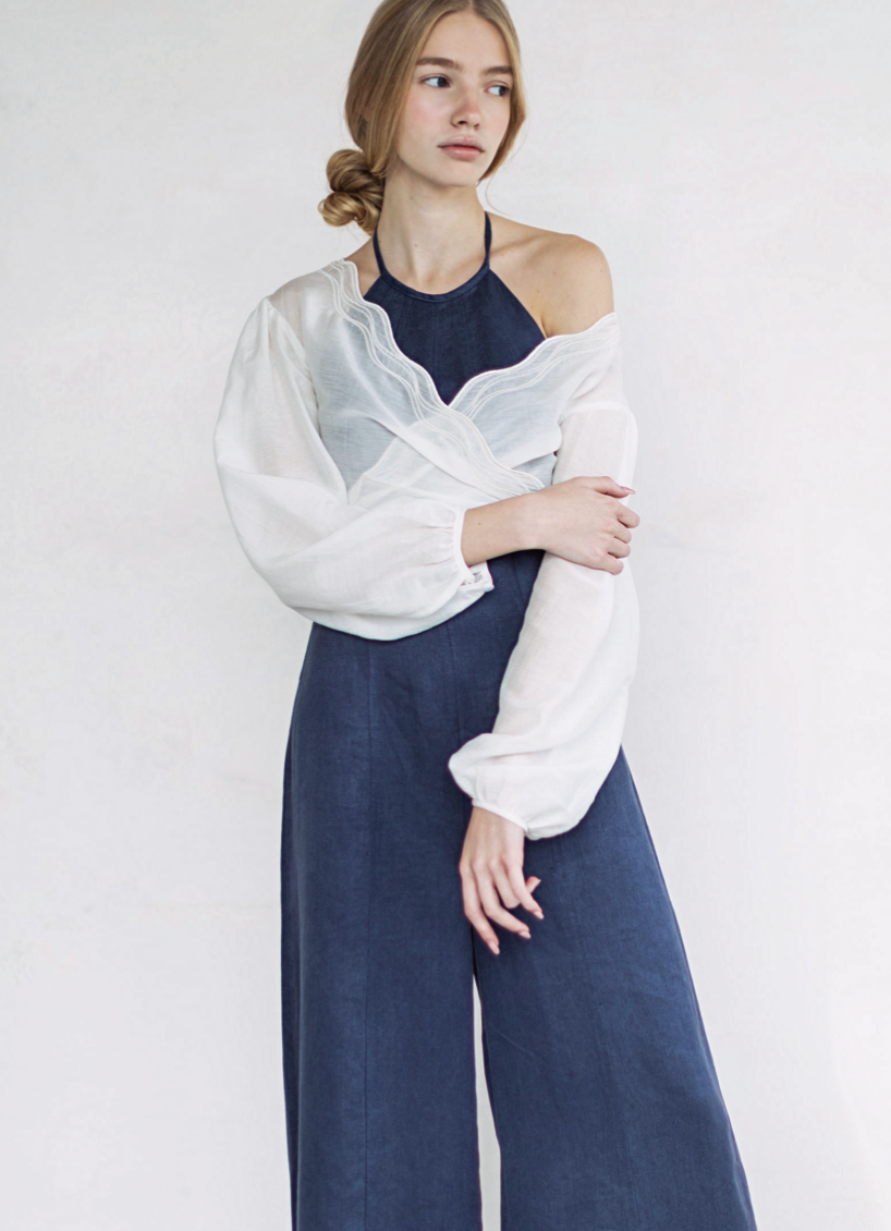 Dark blue jumpsuit with voluminous stitching. One and done: this fitted braid top and dramatic palazzo pants jumpsuit is the ultimate in sophisticated ease. Crafted from hemp, with a silky and polished touch.
