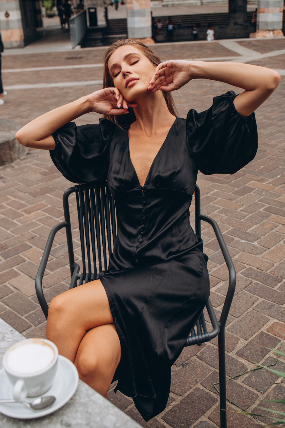 Midi organic peace silk dress with puffed sleeves