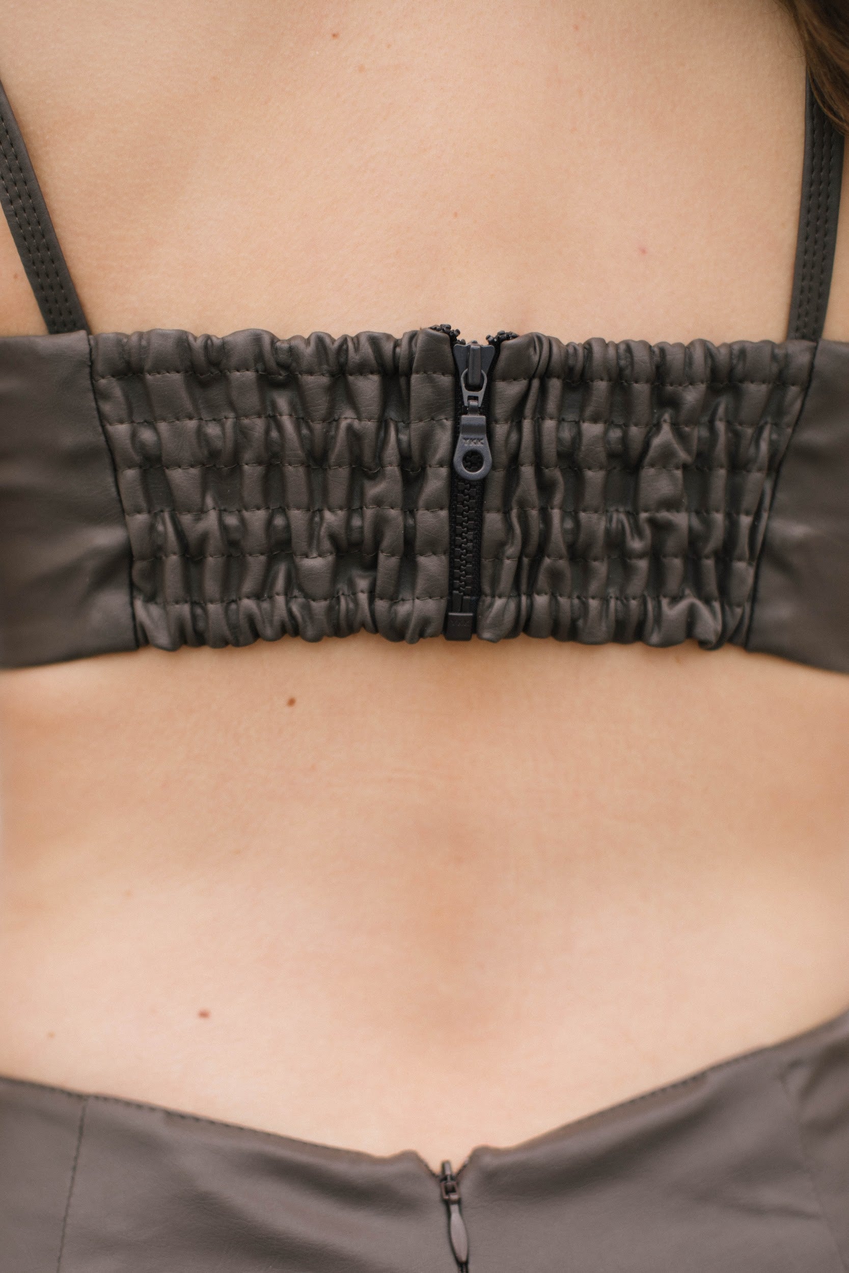 Shoulder straps provide support, the top is decorated with stitching, elastic band and zipper on the back for an extra comfort.
