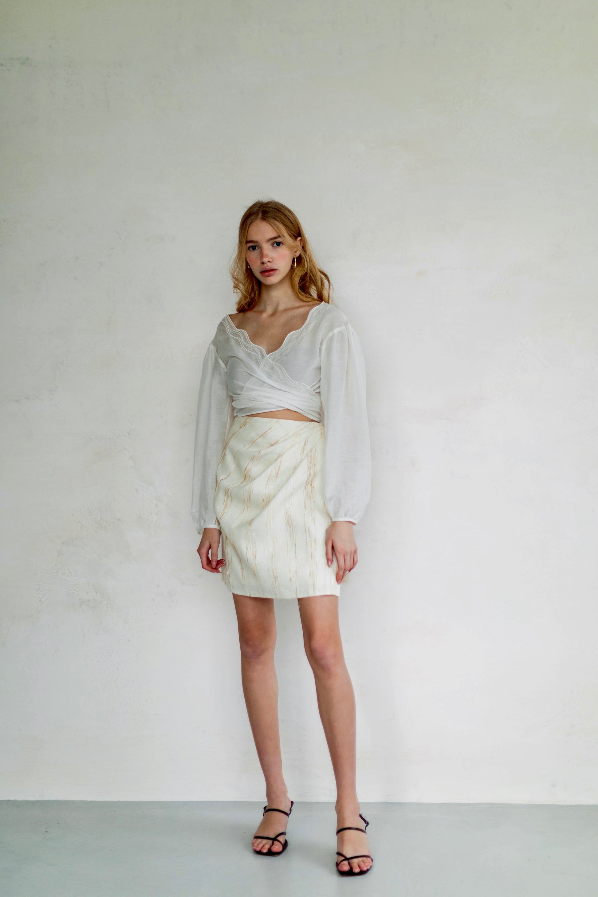 Tweed weave instills this mini skirt with tactile charm, ruffles cascade down the front. The effect of stripes is created by weaving fibers of different shades of natural color.